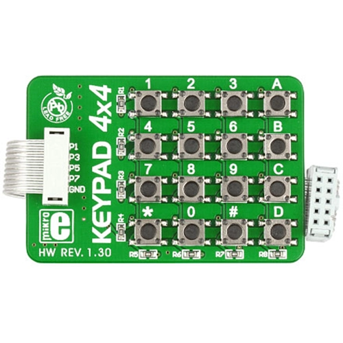 4 x 4-Tastenfeldplatine verfügt über 16 Tasten, Anordnung der Tasten in 4 x 4-Matrix zur Bildung einer gewöhnlichen alphanumerischen Tastatur, Verwendung der Platine als Lösung bei einigen eingebetteten Systemen, die Benutzereingaben in Form von dezimalen oder hexadezimalen Zahlen erfordern, Platine verfügt über ein Flachkabel mit IDC-10-Buchse welches mit allen Entwicklungsplatinen von MikroElektronika kompatibel ist.