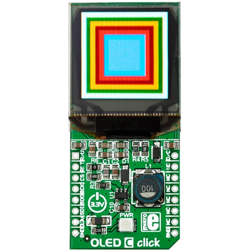 Interface: SPI,Power Supply: 3.3V,On-board modules: PSP27801 OLED display, SSD1351 OLED driver with controller,Applications: Ideal for displaying bright and crisp color images, text or icons,Key Features: 96 x 96px resolution, displaying 65K colors, 256-step contrast and 262K color control,Key Benefits: vertical and horizontal scrolling, programmable frame rate and multiplex ratio, support for various color depths,Compatibility: mikroBUS,Product Type: OLED,Click board size: L (57.15 x 25.4 mm)
