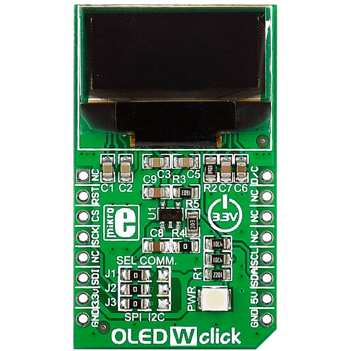 Interface: I2C or SPI,Power Supply: 3.3V,On-board modules: SSD1306 controller, 96 x 39px white monochrome passive matrix OLED display,Applications: Ideal for displaying bright and crisp white text or icons,Key Features: Monochrome white OLED display, 96 x 39px resolution, 19.3 x 7.8mm active area,Key Benefits: Onboard controller enables scrolling, contrast control etc.,Compatibility: mikroBUS,Product Type: OLED,Click board size: M (42.9 x 25.4 mm)