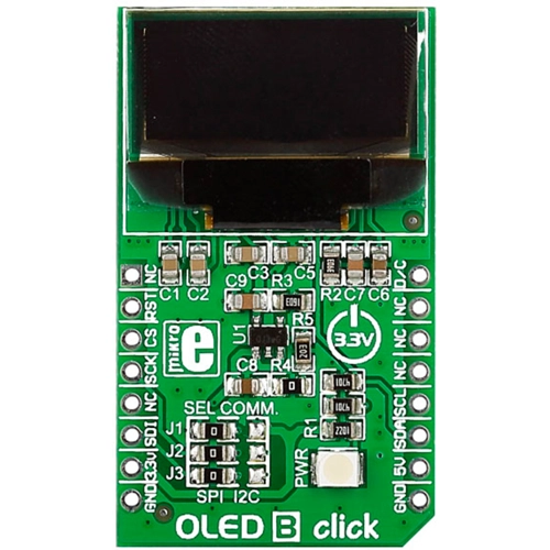 Interface: I2C or SPI,Power Supply: 3.3V,On-board modules: SSD1306 controller, 96 x 39px blue monochrome passive matrix OLED display,Applications: Ideal for displaying bright and crisp blue text or icons,Key Features: 96 x 39px resolution, 19.3 x 7.8mm active area,Key Benefits: Onboard controller enables scrolling, contrast control etc.,Compatibility: mikroBUS,Product Type: OLED,Click board size: M (42.9 x 25.4 mm)
