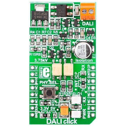 Interface: GPIO,Power Supply: 3.3V or 5V,On-board modules: Two optocouplers, push button and screw terminal,Applications: Board is ideal for controlling network based systems that controls lighting in buildings,Key Features: The board is designed to use 3.3V or 5V power supply. LED diode indicates the presence of power supply,Key Benefits: It is possible to address up to 64 devices in DALI stand alone systems and more than 64 devices as DALI subsystem (gateways),Compatibility: mikroBUS,Product Type: DALI,Click board size: M (42.9 x 25.4 mm)