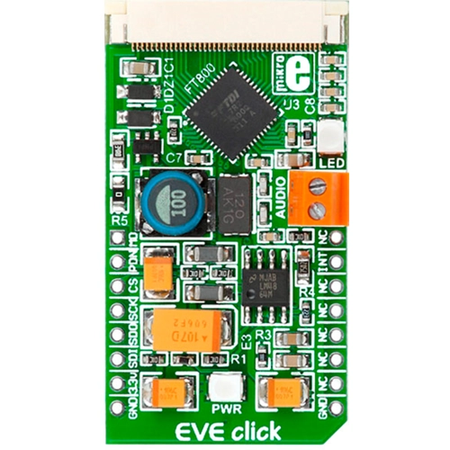 Interface: SPI,Power Supply: 3.3V,On-board modules: FT800Q graphics controller,Applications: EVE click helps you to bring awesome graphics and drive large 4.3" displays even with 8-bit MCUs. It has lots of excellent features and simple interface,Key Features: 40-pin flat cable connector for 4.3" touch screen on-board. Audio amplifier with audio connector provided for mono sound output,Key Benefits: FT800Q combines display, audio and touch-screen features,Compatibility: mikroBUS,Product Type: TFT,Click board size: M (42.9 x 25.4 mm)