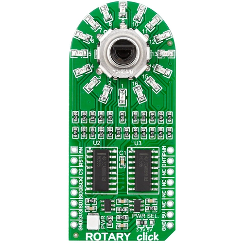 Interface: SPI,Power Supply: 3.3V or 5V,On-board modules: EC12D 15-pulse incremental rotary encoder with detents surrounded by a ring of 16 blue LEDs,Applications: Wheel controllers that spin infinitely are useful for controlling audio/video equipment and similar appliances,Key Features: 30 indents (dividing the rotation into discrete increments). Pushbutton built in the knob,Key Benefits: LED ring for visual feedback,Compatibility: mikroBUS,Product Type: Rotary encoder,Click board size: L (57.15 x 25.4 mm)