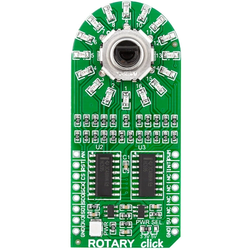 Interface: SPI,Power Supply: 3.3V or 5V,On-board modules: EC12D 15-pulse rotary encoder,Applications: Wheel controllers that spin infinitely are useful for controlling audio/video equipment and similar appliances,Key Features: 30 indents (dividing the rotation into discrete increments), pushbutton built in the knob,Key Benefits: Yellow LED ring for visual feedback,Compatibility: mikroBUS,Product Type: Rotary encoder,Click board size: L (57.15 x 25.4 mm)