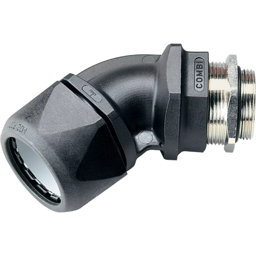 Die kombinierte Schlauch- und Kabelverschraubung CVW 45° EMV wird aus speziell modifiziertem Polyamid 6, thermoplastischem Elastomer und vernickeltem Messing gefertigt. Die Materialien sind halogen-, phosphor- und cadmiumfrei. Klemmbereich: 3-6,5 mm.