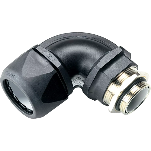 Die kombinierte Schlauch- und Kabelverschraubung CVW 90° EMV wird aus speziell modifiziertem Polyamid 6, thermoplastischem Elastomer und vernickeltem Messing gefertigt. Die Materialien sind halogen-, phosphor- und cadmiumfrei. Klemmbereich: 18-25 mm.