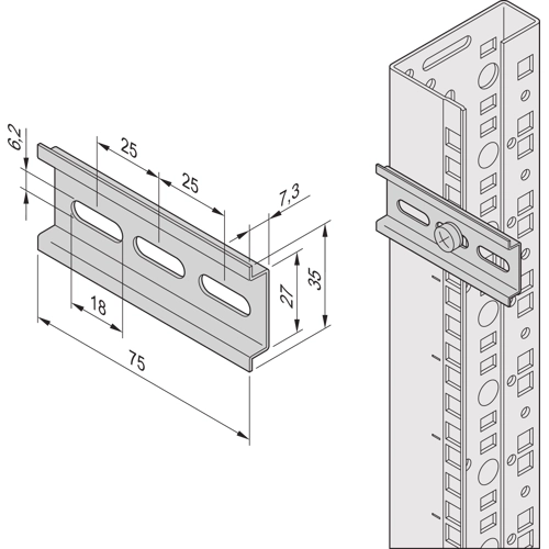 DIN-Schiene mit Befestigungsmaterial-Set. Länge 75 mm.
