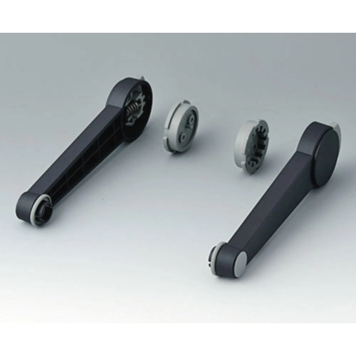 Der Griffbügel läßt sich sowohl von außen als auch von innen befestigen und kann in 135°-Stellung abgenommen werden. Der Rastmechanismus ist in 30°-Stufen verstellbar. Al-Profil (AS053695) in der erforderlichen Länge als separates Zubehörteil (auf Anfrage). Die Profillänge ist 3 mm größer als die Gehäusebreite.
