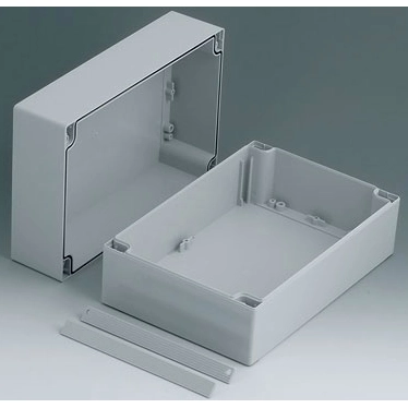 Robustes Kunststoffgehäuse, prädestiniert für Elektro- und Elektronikanwendungen. Gehäuseschalen variabel als Ober- und Unterteil verwendbar. In jedem Gehäuseteil Gewinde und Befestigungstürme. Verschraubung außerhalb des Dichtbereichs. Vertiefung von ca. 0,8 mm für den Einsatz von Folientastaturen.