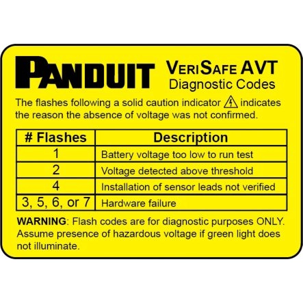 Das Etikett VS-AVT-DL für die Diagnosecodes des VeriSafe-Spannungsfreiheitsprüfers wurde entwickelt, um die AVT-Blitzcodes einfach zu kommunizieren. Es wird empfohlen, es an der Schaltschranktür in der Nähe des VeriSafe-Spannungsfreiheitsprüfers anzubringen.