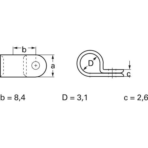 Für Schraubbefestigung bei Innenmontage; Material: PA 6.6, naturfarbig, Entflammbarkeit: UL 94 V-2, Bef.-Loch: 4,2 mm (5,1 mm ab Typ CCH56-S10), Maß a: 9,4 mm (12,7 mm ab Typ CCH56-S10), Maß c: 2,6 mm, Zulassungen: UL (E136577),
