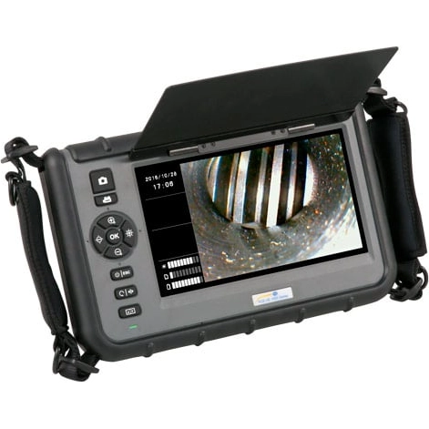 Das Video Endoskop ist ein vielseitiges einsetzbares Inspektionsinstrument. An das Video Endoskop können verschiedenste Endoskopkabel mit unterschiedlichen Eigenschaften angeschlossen werden. Ein besonderer Vorteil von dem Video Endoskop ist das große Display, welches dem Verwender durch seine Abmessungen und Auflösung den bestmöglichen Überblick über die zu betrachtende Fläche bietet. Dabei ermöglicht das Video Endoskop die Aufnahme von Bildern und Videos, wobei die Videos zusätzlich mit einer Audioaufnahme gespeichert werden. Die klare Auflösung wird auch dann deutlich, wenn die Bilder durch Tastendruck auf der eingelegten SD-Karte im Video Endoskop gespeichert werden. Wenn die SD-Karte am Computer ausgelesen wird, werden die aufgenommen Bilder und Videos klar dargestellt. Aufgrund der Tatsache, dass die Aufnahmen auf einem externen Massenspeichergerät gespeichert werden, kann selbst gewählt werden welche SD-Karte in das Video Endoskop eingesetzt wird. Maximal sollte diese jedoch eine Kapazität von 32 GB haben. Eine 32 GB Speicherkarte erlaubt die Speicherung von mehr als 240500 Bildern oder mehr als 1000 Minuten an Videomaterial.