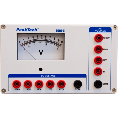 Dieses analoge Voltmeter verfügt über eine Vielzahl an Spannungs-Messbereichen, von 0,1 V bis 1000 V für Messungen im AC Wechselspannungs- und DC Gleichspannungsbereich. Der Anschluss erfolgt über eine 4 mm Sicherheitsbuchse für den jeweiligen Messbereich