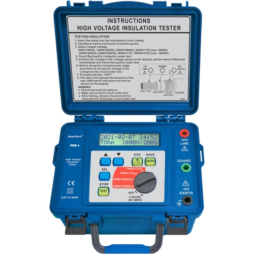 Das PeakTech 2685 A ist ein Hochspannungs - Isolationsmessgerät welches eine Testspannung von bis zu 10.000V erzeugen und ausgeben kann. Mit der Isolationsmessung können Leitungen oder Isolationen von elektrischen Betriebsmitteln überprüft und defekte ermittelt werden. An dem Prüfgerät sind die jeweiligen Buchsen für den Anschluß für jede Leitung markiert, um ein vertauschen oder fehlerhaftes anschließen des zu testendes Gerätes zu verhindern. Durch den Wahlschalter und den Drucktasten können die jeweiligen Messfunktionen schnell und übersichtlich eingestellt werden. Das Isolationsmessgerät ist in einem stabilen Tragekoffer eingebaut, wodurch es auch vor Spritzwasser und äußerlichen Einwirkungen geschützt ist. Mit den neuen Zusatzfunktionen PI (Polarisationsindex) und DAR (Dielektrisches Absorptionsverhältnis) wächst die Anwendungmöglichkeit des PeakTech 2685 A entgegen zu seinem Vorgänger. Durch seine Funktionen und hohen Messbereichen, ist das PeakTech 2685 A optimal für den täglichen Gebrauch in der Elektrotechnik anzuwenden, da es in nahezu jedem Bereich in dem eine Isolationsmessung von nöten ist, seinen Einsatzbereich findet.