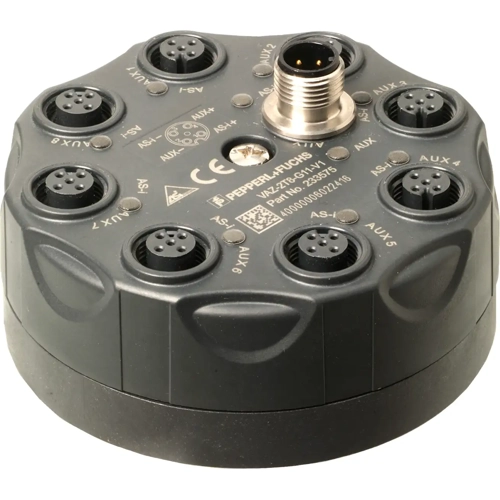 Passivverteiler M12 AS-Interface und Hilfsspannung auf 8 x M12-Rundsteckverbinder.