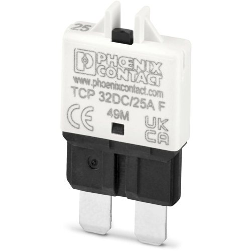 1-kanalige, thermischer Geräteschutzschalter zum Schutz von Verbrauchern an bis zu 32 V DC bei Überlast. Sicherungstyp: flink. Steckbar auf Sicherungsklemmen und Schnittstellen für Flachstecksicherung der Form C nach Standard ISO 8820-3. Mit festem Nennstrom: 25 A.