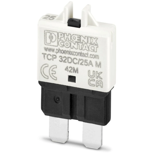 1-kanalige, thermischer Geräteschutzschalter zum Schutz von Verbrauchern an bis zu 32 V DC bei Überlast. Sicherungstyp: träge. Steckbar auf Sicherungsklemmen und Schnittstellen für Flachstecksicherung der Form C nach Standard ISO 8820-3. Mit festem Nennstrom: 25 A.