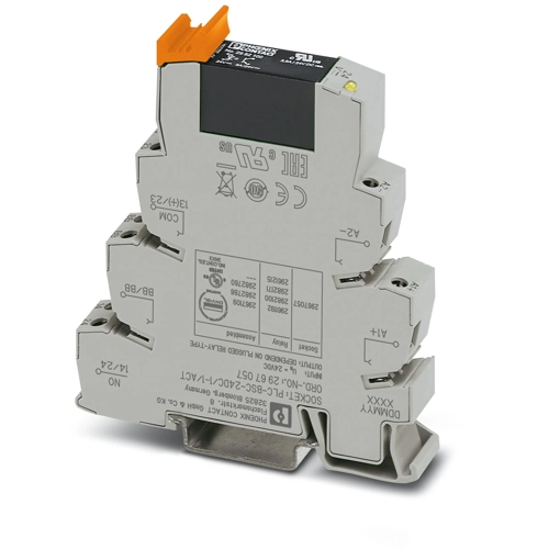 PLC-INTERFACE für Ausgabefunktionen, bestehend aus Grundklemme PLC-BSC.../ACT mit Schraubanschluss und steckbarem Miniatur-Solid-State-Relais, zur Montage auf Tragschiene NS 35/7,5, 1 Schließer, Eingang: 24 V DC, Ausgang: 3 ... 33 V DC/5 A.