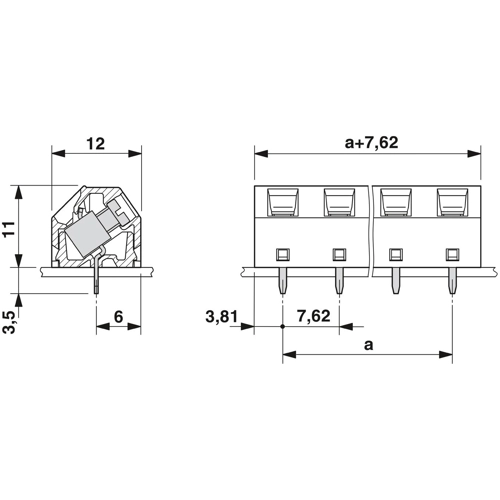 PCB-Klemmenblock, Nennstrom: 16 A, Nennspannung (III/2): 630 V, Nennquerschnitt: 1,5 mm², Anzahl der Potentiale: 5, Anzahl der Reihen: 1, Anzahl der Positionen pro Reihe: 5, Stellplatz: 7,62 mm, Verbindungsmethode: Verschraubung mit Spannhülse, Schraubenkopf-Form: L geschlitzt, Leiter/PCB-Anschlussrichtung: 45 °, Farbe: grün, Pin-Layout: lineares Pinning, Lötstift: 3,5 mm, Anzahl der Lötstifte pro Potential: 1.