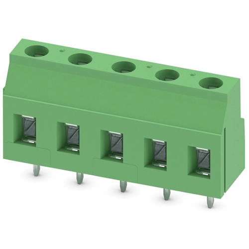 PCB-Klemmenblock, Nennstrom: 24 A, Nennspannung (III/2): 630 V, Nennquerschnitt: 2,5 mm², Anzahl der Potentiale: 5, Anzahl der Reihen: 1, Anzahl der Positionen pro Reihe: 5, Stellplatz: 7,62 mm, Verbindungsmethode: Verschraubung mit Spannhülse, Schraubenkopf-Form: L geschlitzt, Leiter/PCB-Anschlussrichtung: 0 °, Farbe: grün, Pin-Layout: lineares Pinning, Lötstift: 5 mm, Anzahl der Lötstifte pro Potential: 1.