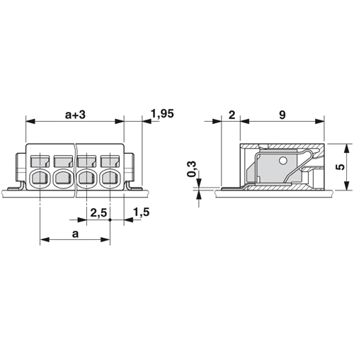 PCB-Klemmenblock, Nennstrom: 6 A, Nennspannung (III/2): 160 V, Nennquerschnitt: 0,5 mm², Anzahl der Potentiale: 5, Anzahl der Reihen: 1, Anzahl der Positionen pro Reihe: 5, Stellplatz: 2,5 mm, Verbindungsmethode: Steckfederanschluss, Leiter/PCB-Anschlussrichtung: 0 °, Farbe: Signalweiß, Pin-Layout: lineare Kissengeometrie, Anzahl der Lötstifte pro Potential: 1.