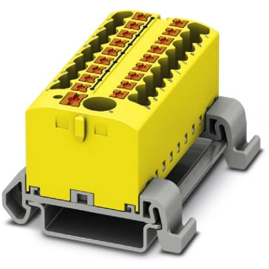 Verteilerblock, der Block kann über den Leiterschacht miteinander gebrückt werden, entsprechende Steckbrücken siehe Zubehör, Block mit horizontaler Ausrichtung und integrierter Versorgung, Nennspannung: 690 V, Nennstrom: 24 A, Anschlussart: Push-in-Anschluss, Lastkontakt, Querschnitt: 0,14 mm² - 4 mm², Push-in-Anschluss, Linienkontakt, Nennquerschnitt: 6 mm², Querschnitt: 0,5 mm² - 10 mm², Befestigungsart: NS 35/7,5, NS 35/15, Farbe: gelb.