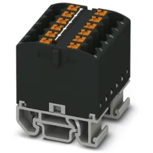 Verteilerblock, der Block kann über den Leiterschacht miteinander gebrückt werden, entsprechende Steckbrücken siehe Zubehör, Block mit horizontaler Ausrichtung, Nennspannung: 690 V, Nennstrom: 24 A, Anschlussart: Push-in-Anschluss, Querschnitt: 0,14 mm² - 4 mm², Montageart: NS 15, Farbe: grün.