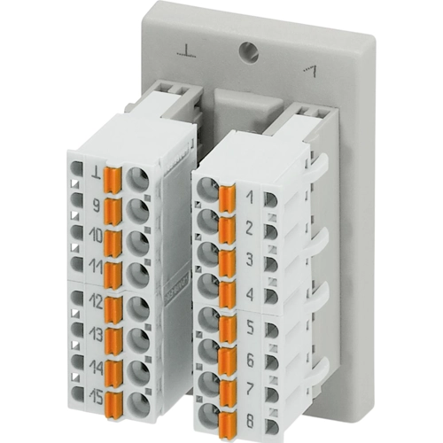 Das VARIOFACE-Durchführungsmodul realisiert eine 1:1-Verbindung zwischen steckbaren Push-in Federkraftanschlussklemmen und einer D-Subminiatur-Buchsenleiste (Polzahl 15).