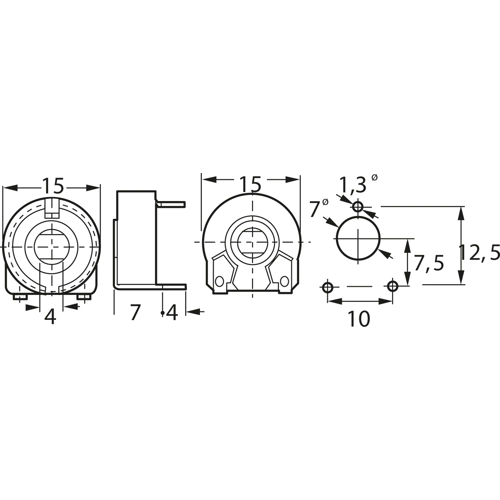 Potentiometer verfügt über ein 15-mm-Widerstandselement aus Kohlenstoff. Es ist in einem staubdichten Gehäuse untergebracht und hat ein Polyester-Substrat.