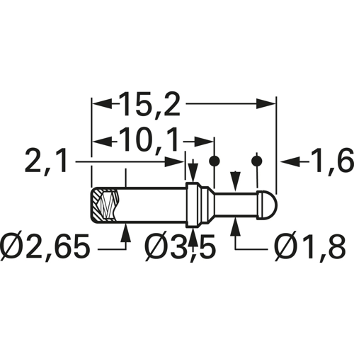 Rastermaß: 4,0 mm, Maximal-Hub: 3,5 mm, Arbeitshub: 2,8 mm, Federkraft bei Arbeitshub (±20 %): 1,5 N, Federvorspannung: 0,45 N, Strombelastung: max. 10 A, Durchgangswiderstand: typ. 10 mOhm, Gehäuse: Messing, vergoldet, Feder: Edelstahl, vergoldet.