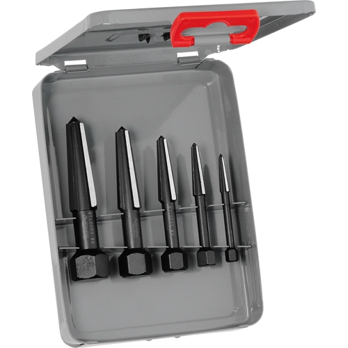 5-teilig, in Metallkassette, zum beschädigungsfreien Ausdrehen von abgebrochenen Schrauben oder Gewindebolzen aus Gewindebohrungen, für Schrauben M5 bis M20, für Rechts- und Linksgewinde verwendbar.