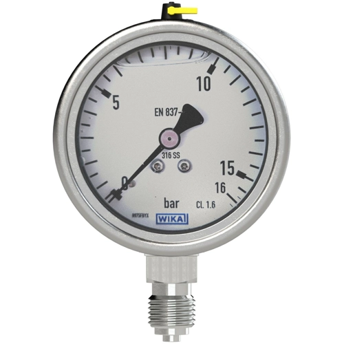 Glyzerinmanometer, CrNi-Stahl, Anschluss radial unten, G 1/4, Güteklasse 1,6, Messbereich 0 - 6 bar, Ø 63. Rohrfedermanometer mit Glyzerinfüllung in CrNi-Stahl-Ausführung. Für den Einsatz in der chemischen/petrochemischen Prozessindustrie, Kraftwerken, Maschinen- und Anlagenbau. Für Messstellen mit hohen dynamischen Druckbelastungen und Vibrationen. Geeignet für gasförmige und flüssige, aggressive, nicht hochviskose und nicht kristallisierende Messstoffe, auch in aggressiver Umgebung.