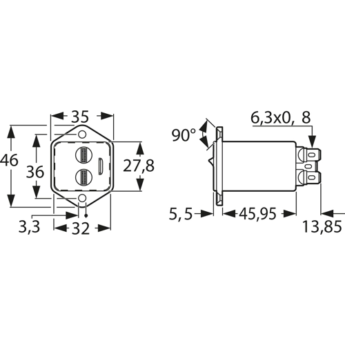 IEC-Eingangsfilter-C14, 50 bis 400 Hz, 2 A, 250 VAC, 2.7 mH, Flachstecker 6,3 mm, FN9264-2-06