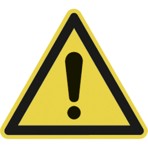 Symbol für: Allgemeines Warnzeichen. Verklebung im Innen- und Außenbereich möglich, nach DIN EN ISO 7010-W0101, ASR A1.3 W001. Material: Selbstklebende Kunststofffolie glänzend, Seitenlänge: 100 mm, Materialstärke: 0,08 bis 0,1 mm, Temperaturbeständigkeit: –30 bis +70°C, Verklebungstemperatur: über +8,0 °C.