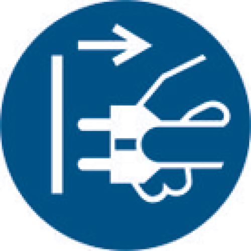 Gebotsschild nach DIN EN ISO 7010-M006; Piktogramm: Netzstecker ziehen. Material: Kunststofffolie, glänzend, Materialstärke: 0,08 bis 0,1 mm stark, Farbe: weiß-blau, Temperaturbeständigkeit: –30 bis +70 °C. Verklebungstemperatur: über +8,0 °C.