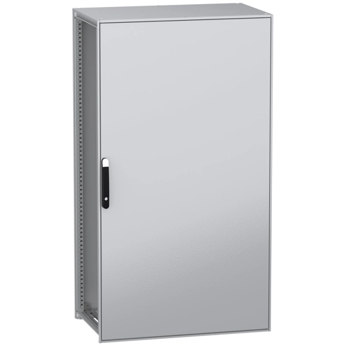 This PanelSeT SFN is a floor standing modular decarbonized steel electrical enclosure that is suitable for multi-purpose applications. It contains recycled steel, which is produced with renewable energy, resulting into a significant reduction of CO2 emissions. It has a nominal height, width, and depth of 1800 mm, 1000 mm and 600 mm, respectively. The frame and uprights of the enclosure are made of galvanized steel for durability. The door and panels are made of steel sheets, while the handle is made of polyamide 6 with 30% fiberglass. An epoxy-polyester powder finish provides a smooth appearance. The enclosure has a grey (RAL 7035) color with a black (RAL 9005) handle, one plain door, one rear panel, one roof, two sliding rails and one set of quick-fixing mounting plate brackets. The door has an aperture up to 120 degrees and is reversible, meaning it can be opened from either side. The door has a four-point lock with a handle that has a 5 mm double-bar insert for security. The enclosure has an IP55 rating, which makes it resistant to dust, water and oil ingress. The enclosure is also resistant to impacts, with an IK10 rating. Operation is convenient due to rear, front, and side access.