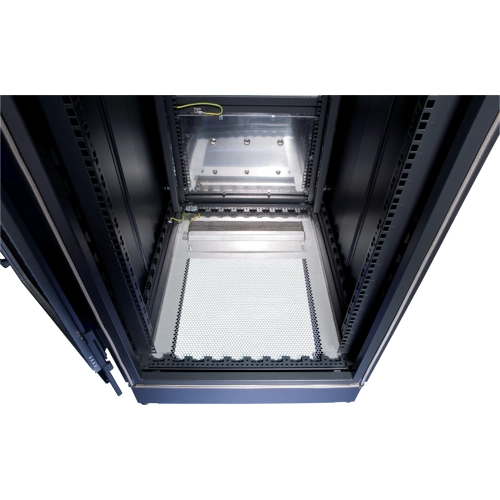 Das Bodenblech ist eine perforierte Stahlabdeckplatte, die auf den Schrankboden passt. Hoher Luftdurchsatz durch perforierte Öffnungen aus dem Bodenhohlraum in den Schrank; kann für Kabelkanäle geöffnet werden.
