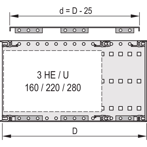 Eine Abdeckplatte wird zur elektromagnetischen Abschirmung oder als mechanischer Schutz verwendet. Die Abdeckung kann an die Seitenwand geschraubt werden.