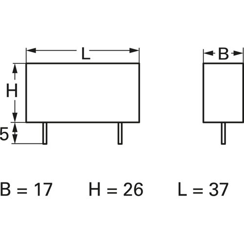 Selbstheilend, in rechteckigem Kunststoffbecher mit Epoxydharzverguss, schwer entflammbar, mit metallisierter Polypropylen-Folie als Dielektrikum