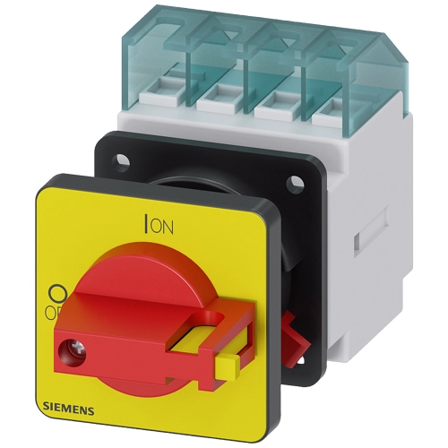 SENTRON, Lasttrennschalter 3LD, Not-Aus-Schalter, 3- polig, Iu: 16 A, Betriebsleistung / bei AC-23 A bei 400V: 7,5 kW, Frontbefestigt, Knebelantrieb, rot/gelb, Zentralbefestigung 22,5mm der Handhabe Haupt- und NOT-AUS-Schalter SENTRON 3LD2 für das sichere Abschalten von Lasten in vielen Bereichen, z.B. für Drehstrommotoren, Klima- und Lüftungsanlagen, in Be- und Verarbeitungsmaschinen des Maschinen- und Förderanlagenbaus, in der chemischen oder in der Nahrungsmittel- und Getränkeindustrie. Modularer Aufbau, schnelle einfache Montage von Hilfsschaltern, N-PE-Klemme oder 4. Pol. Optimale Netztrennung von 16 A bis 250 A durch Abschließbarkeit des Drehantriebes. Schutzart bis IP 65 mit gekapseltem Gehäuse für Anwendungen im Freien. Vielseitig und weltweit einsetzbar dank internationaler IEC-, UL-, CCC- sowie Schiffbau-Approbationen. Die Haupt- und NOT-AUS-Schalter 3LD sind in vielfältigen Varianten erhältlich für Frontbefestigung, Montageplatte, Hutschiene oder Verteilereinbau, wahlweise mit Direkt- oder Türkupplungs-Drehantrieb. Bei 3LD2 sind auch Varianten für Gleichstromanwendungen verfügbar. Haupt- und NOT-AUS-Schalter 3LD - Durchgängige Sicherheit für Anwender und Systeme.