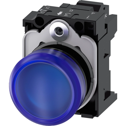 Leuchtmelder, 22 mm, rund, Kunststoff, blau, Linse, glatt, mit Halter, LED-Modul, MIT INTEGRIERTER LED AC/DC 24V, Federzuganschluss Leuchtmelder SIRIUS ACT zur Signalisierung von Schaltzuständen oder Störungen in Anlagen mit brillianter Leuchtkraft dank energieeffizienter LED-Technologie. Das innovative Aufschnappkonzept vereinfacht die Montage so weit, dass dafür nur eine Hand und kein Spezialwerkzeug erforderlichist. Als Montagebohrungen genügen nutfreie Löcher, da bereits ein 100%iger Verdrehschutz integriert ist. Dank der durchgängig hohen Schutzart sind die robusten Geräte industrietauglich und für den Außeneinsatz geeignet. Sogar die Reinigung mit Hochdruckstrahl ist möglich. Weder Staub, Öle noch aggressive Laugen können den zuverlässigen Betrieb stören. Neben der Standardverdrahtung können die meisten Geräte auch über PROFINET, AS-Interface oder IO-Link an die Steuerung angebunden werden. Damit reduzieren Sie Ihren Verdrahtungsaufwand, minimieren Fehlerquellen und gewinnen mehr Flexibilität. Komfortabel unterstützt der grafische Online-Konfigurator bei Auswahl und Bestellung von Einzelgeräten, Gehäusen und Beschriftungen. SIRIUS ACT - Performance in Action beim Befehlen und Melden. Einfach montiert, einfach stark, einfach perfekt.
