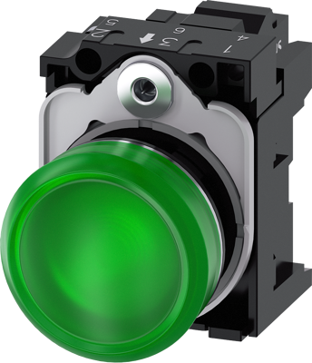 Leuchtmelder, 22 mm, rund, Metall, hochglanz, grün, Linse, glatt, mit Halter, LED-Modul mit integrierter LED AC 230 V, Federzuganschluss Leuchtmelder SIRIUS ACT zur Signalisierung von Schaltzuständen oder Störungen in Anlagen mit brillianter Leuchtkraft dank energieeffizienter LED-Technologie. Das innovative Aufschnappkonzept vereinfacht die Montage so weit, dass dafür nur eine Hand und kein Spezialwerkzeug erforderlichist. Als Montagebohrungen genügen nutfreie Löcher, da bereits ein 100%iger Verdrehschutz integriert ist. Dank der durchgängig hohen Schutzart sind die robusten Geräte industrietauglich und für den Außeneinsatz geeignet. Sogar die Reinigung mit Hochdruckstrahl ist möglich. Weder Staub, Öle noch aggressive Laugen können den zuverlässigen Betrieb stören. Neben der Standardverdrahtung können die meisten Geräte auch über PROFINET, AS-Interface oder IO-Link an die Steuerung angebunden werden. Damit reduzieren Sie Ihren Verdrahtungsaufwand, minimieren Fehlerquellen und gewinnen mehr Flexibilität. Komfortabel unterstützt der grafische Online-Konfigurator bei Auswahl und Bestellung von Einzelgeräten, Gehäusen und Beschriftungen. SIRIUS ACT - Performance in Action beim Befehlen und Melden. Einfach montiert, einfach stark, einfach perfekt.