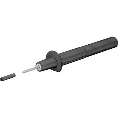 4 mm Sicherheitsprüfspitze schwarz. Geschliffene Ø 2 mm-Edelstahlspitze. Der abgeflachte Griffschutzkragen verhindert ein Abrollen von schrägen Flächen und ermöglicht es, die Prüfspitzen eng nebeneinander zu stecken. Starre Ø 4 mm-Buchse im Isolierkörper, geeignet zur Aufnahme federnder Ø 4 mm-Stecker mit starrer Isolierhülse. Lieferung mit Schutzkappe.