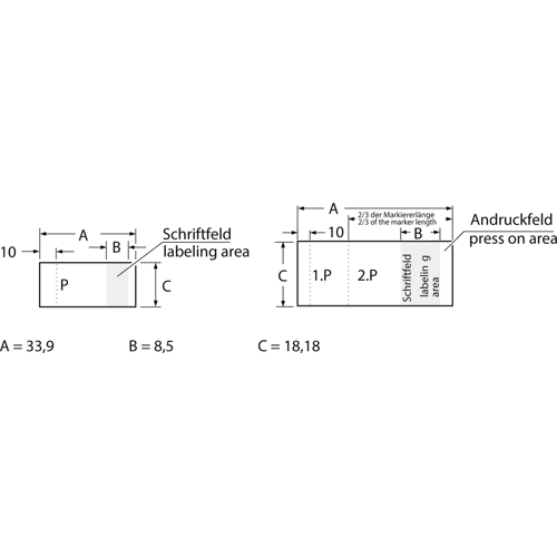 Technische Merkmale (Typ, Maße, Kabel-Außen-D, Markiereranzahl p. Bogen (MB)/in Reihenzahl (R), Perforationen (P)): 3418 PW, A 33,9, B 8,5, C 18,18 mm, D 5,0, MB 88/R 11, 0 P