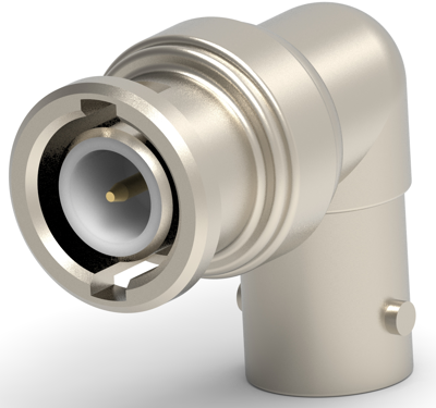 50-Ohm-BNC-HF-Koaxial-Rechteckwinkeladapter mit einer Stecker-Buchsen-Konfiguration (m-f) und Bajonettverschluss.