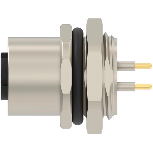 Standard-Rundsteckverbinder, Draht-zu-Schalttafel, 2 Positionen, abdichtbar, Leiterplatte, Signal, Nickel, Messing, D Polarisierungscode.