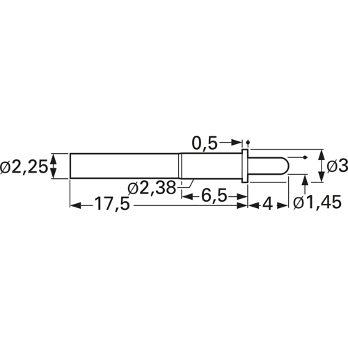 Führungshülse aus vergoldeter Bronze, Feder aus vergoldetem Stahl; Kopf: CuBe vergoldet, Nennstrom: 3,0 A, max. Federweg: 4,0 mm, Arbeitshub: 3,0 mm, Federkraft: 170 cN ±20 %, Durchgangswiderstand: max. 40 mOhm.