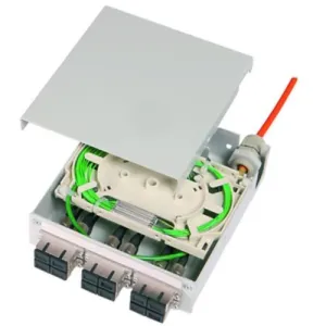 STX Tragschienen-Verteiler mit 6x SC Duplex, Singlemode, Spleißkassette, Pigtails, 12x E9/125, SC (eingefärbt und spleißfertig abgesetzt),Metallgehäuse.