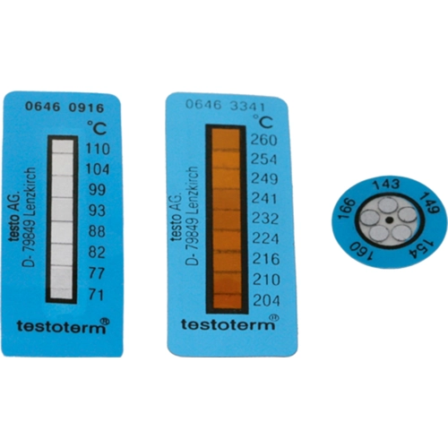 Selbstklebend, mit kurzer Ansprechzeit. Bei Erreichung des Temperaturwertes erfolgt innerhalb von 2,0 s ein irreversibler Farbumschlag von hellgrau auf schwarz. Die Schwarzfärbung bleibt auch nach späterer Abkühlung erhalten; Lagertemperatur: max. +25 °C. Die Streifen können sehr lange gelagert werden und haben 8 oder 9 wärmeempfindliche Elemente (Temp.-Messpunkte) und eine Skala mit Temperaturangaben in °C und °F, Maße: Streifen Messpunkten 50 x 19 mm,