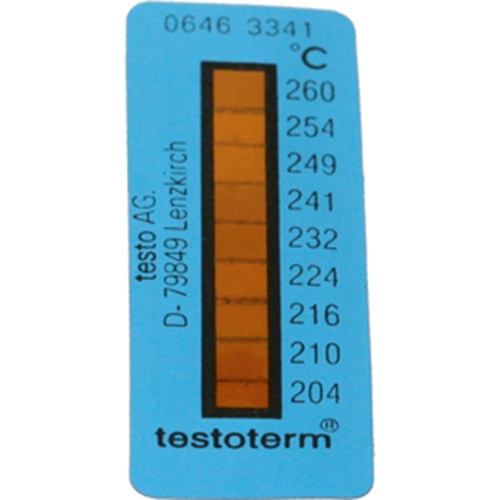Selbstklebend, mit kurzer Ansprechzeit. Bei Erreichung des Temperaturwertes erfolgt innerhalb von 2,0 s ein irreversibler Farbumschlag von hellgrau auf schwarz. Die Schwarzfärbung bleibt auch nach späterer Abkühlung erhalten; Lagertemperatur: max. +25 °C. Die Streifen können sehr lange gelagert werden und haben 8 oder 9 wärmeempfindliche Elemente (Temp.-Messpunkte) und eine Skala mit Temperaturangaben in °C und °F, Maße: Streifen mit 9 Messpunkten 50 x 19 mm,